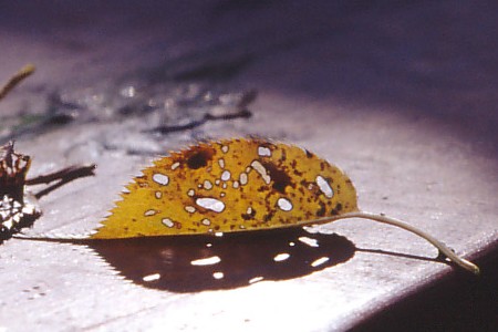 晩秋の昼下がり Out夏の思い出 2020.11.25 木々の葉もその多くが散ってしまい、冬の足音が聞こえる晩秋の昼下がり、公園のテーブルの上に差し込んだ陽ざしを浴びる枯れ葉たち。葉に残された夏の虫たちの活動の跡が懐かしい。
